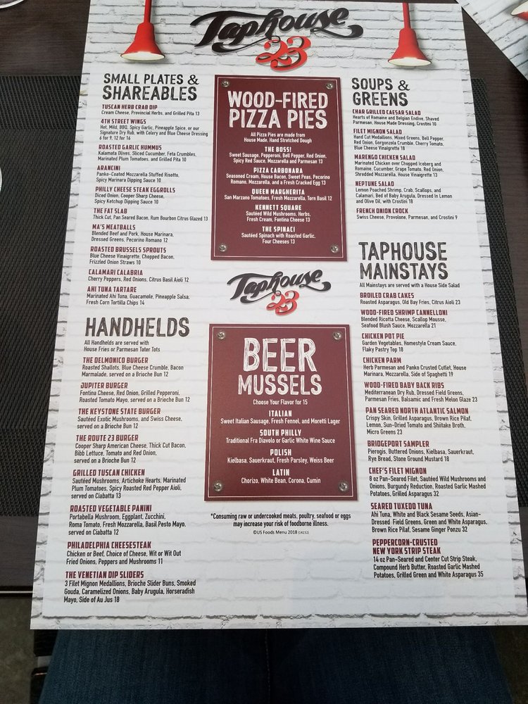 Taphouse 23 is a bustling New American bar located in Bridgeport, PA. This restaurant offers a wide range of amenities, including reserved seating, takeout options, and an extensive menu featuring many vegetarian dishes. With wheelchair accessibility and a variety of payment options, Taphouse 23 caters to all guests. The casual atmosphere, complete with outdoor seating and free Wi-Fi, makes it an ideal spot for groups, families, and even children. The restaurant also boasts a full bar, TV entertainment, and special happy hour deals on Wednesday, Friday, and Saturday nights. From private dining options to pool tables and bike parking, Taphouse 23 provides a diverse dining experience for all.